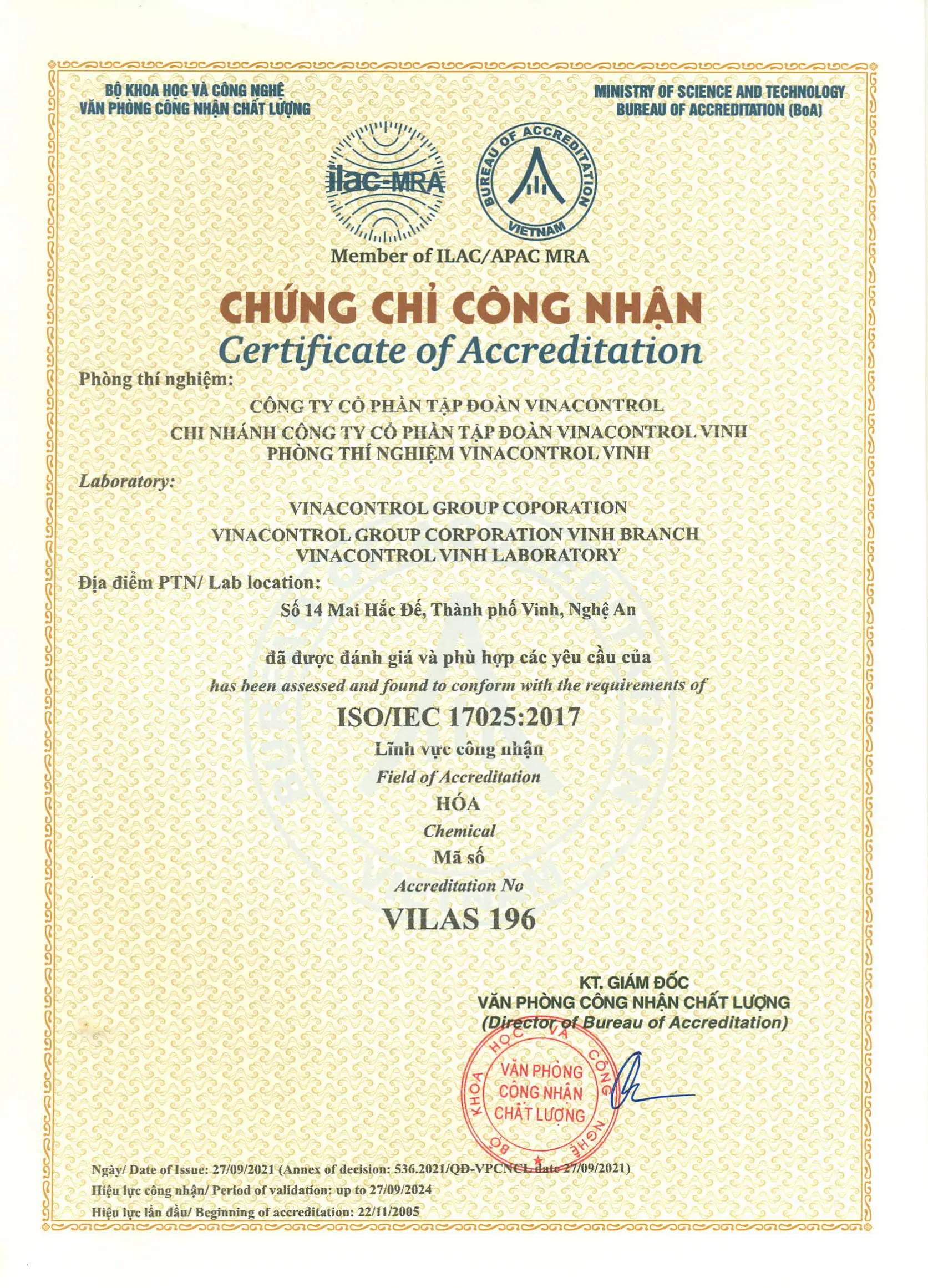 ISO/IEC 17025:2017 (VILAS 196) - Phòng thí nghiệm Vinacontrol Vinh