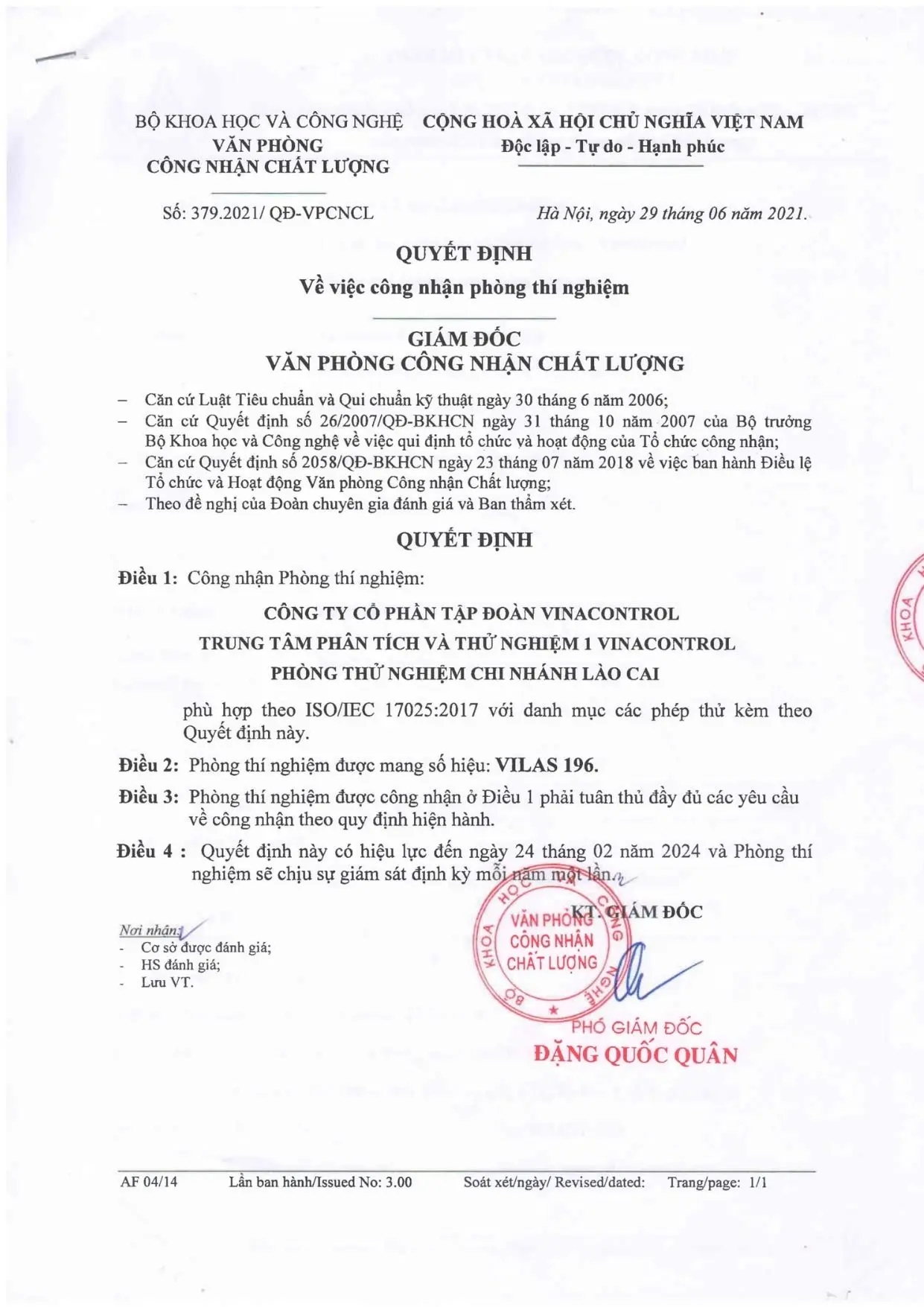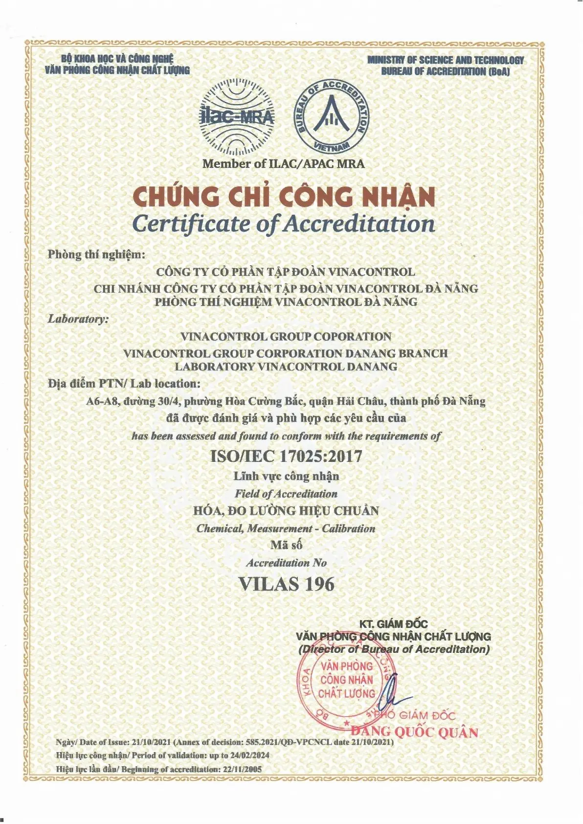 ISO/IEC 17025:2017 (VILAS 196) - Phòng thí nghiệm Vinacontrol Đà Nẵng