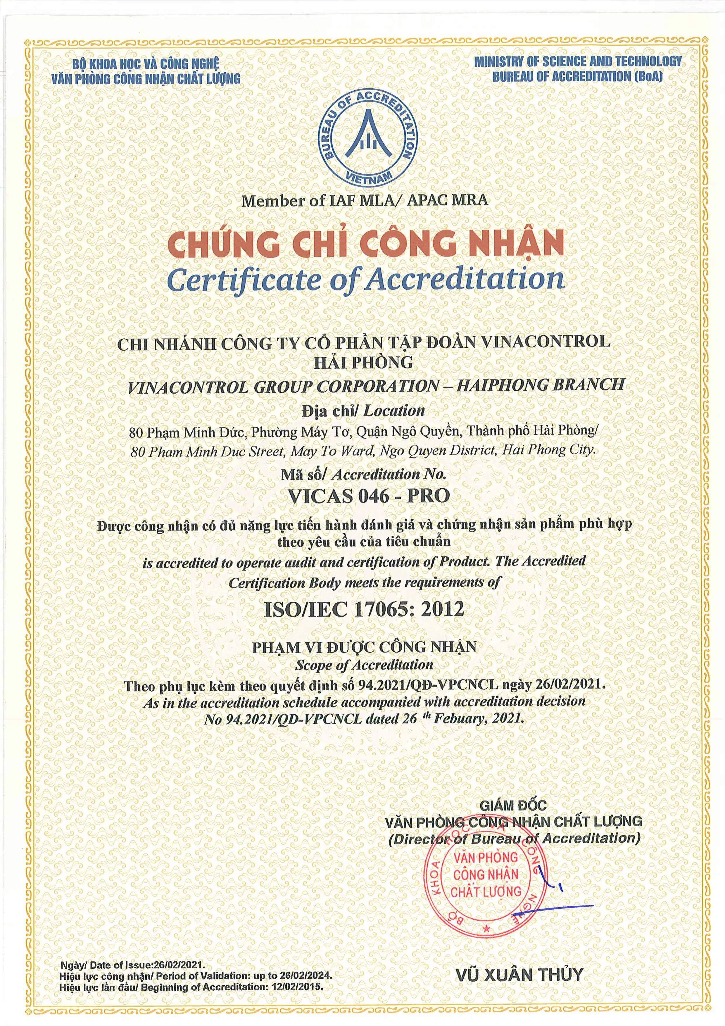 ISO/IEC 17065: 2012 (VICAS 046-Pro) - Vinacontrol Hải Phòng
