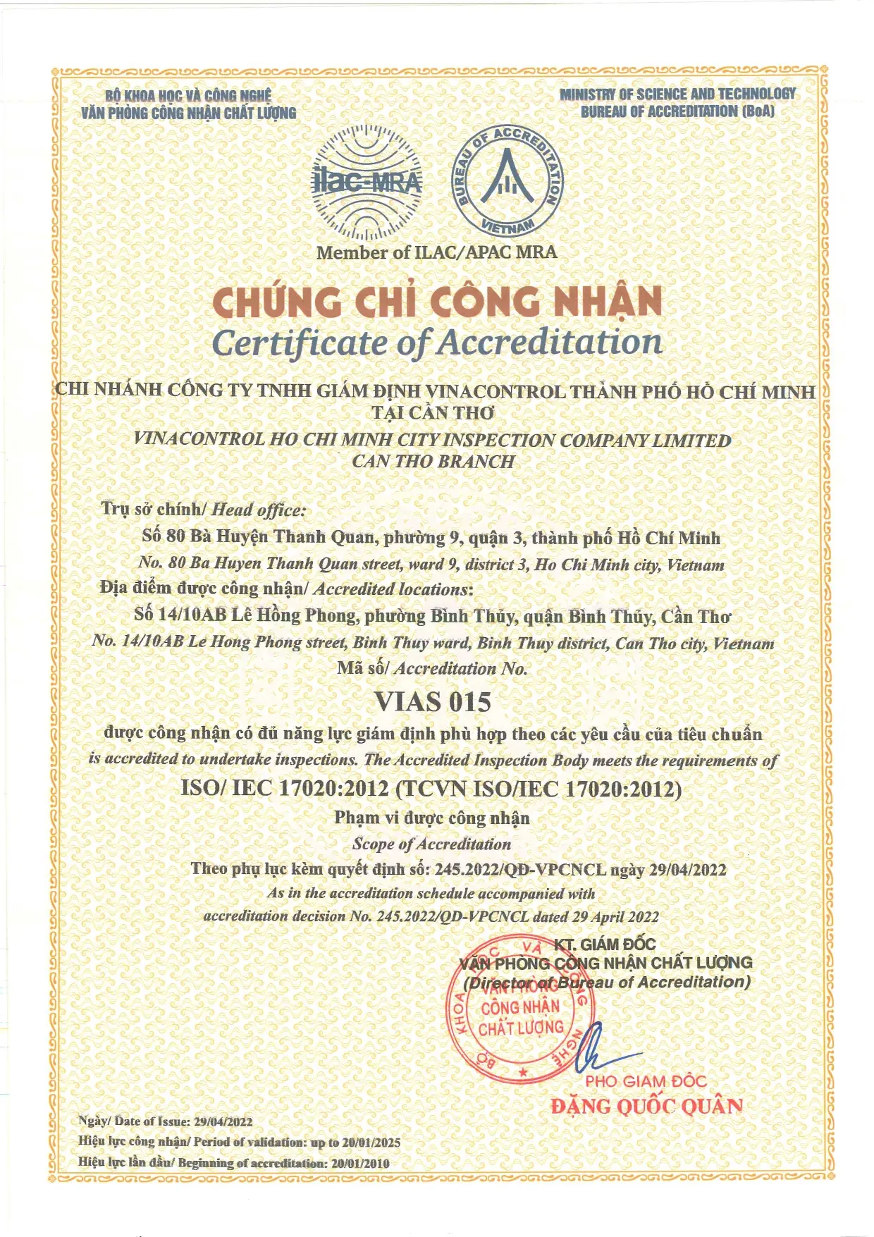 ISO/IEC 17020:2012 (VIAS 015) - Vinacontrol Cần Thơ