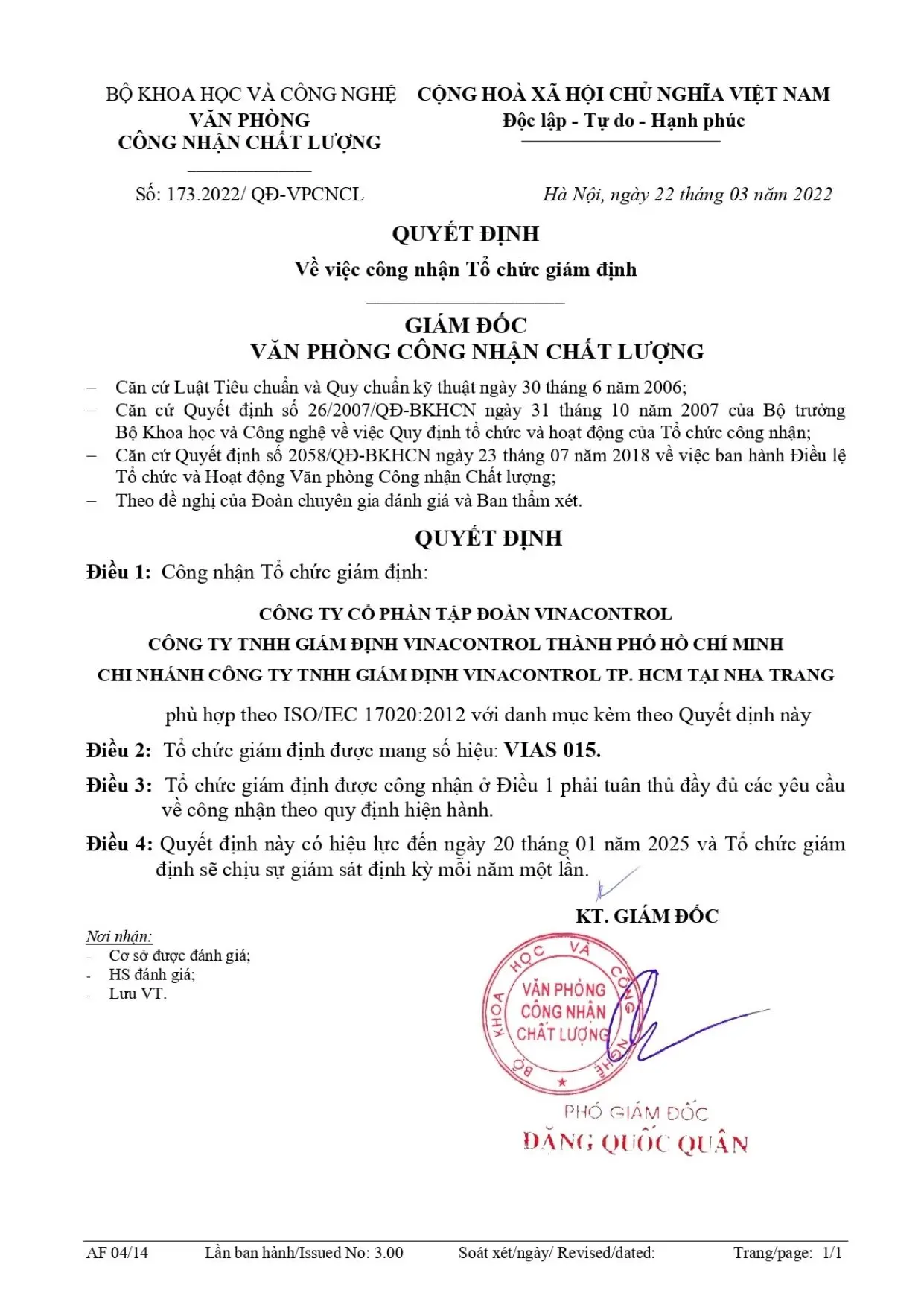 ISO/IEC 17020:2012 (VIAS 015) - Vinacontrol Nha Trang