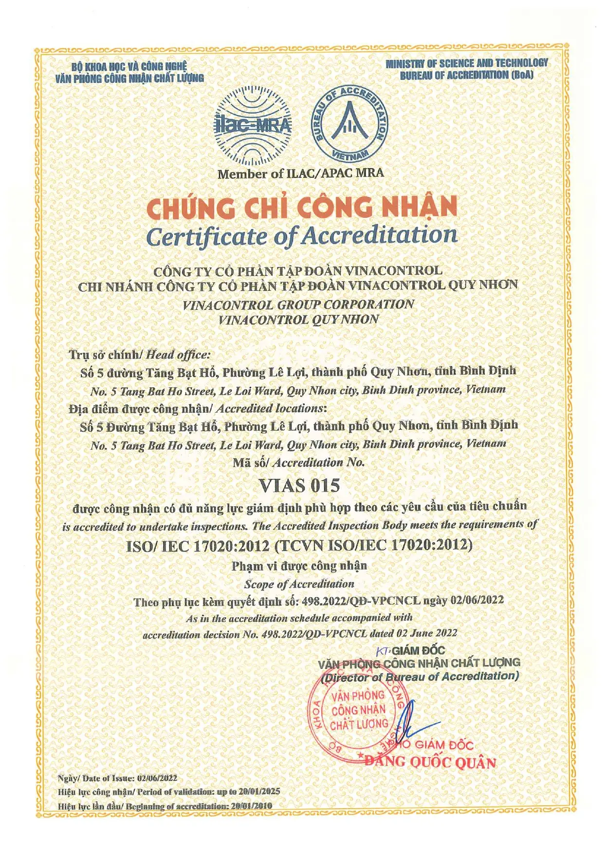 ISO/IEC 17020:2012 (VIAS 015) - Vinacontrol Quy Nhơn