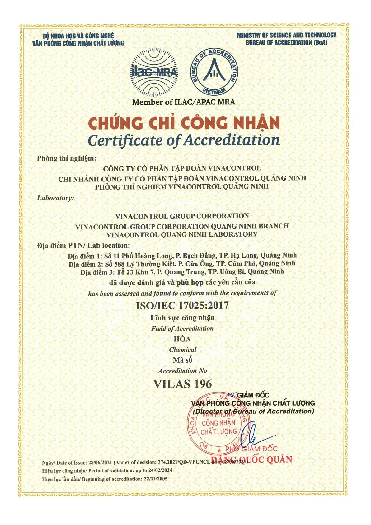 ISO/IEC 17025:2017 (VILAS 196) - Phòng thí nghiệm Vinacontrol Quảng Ninh