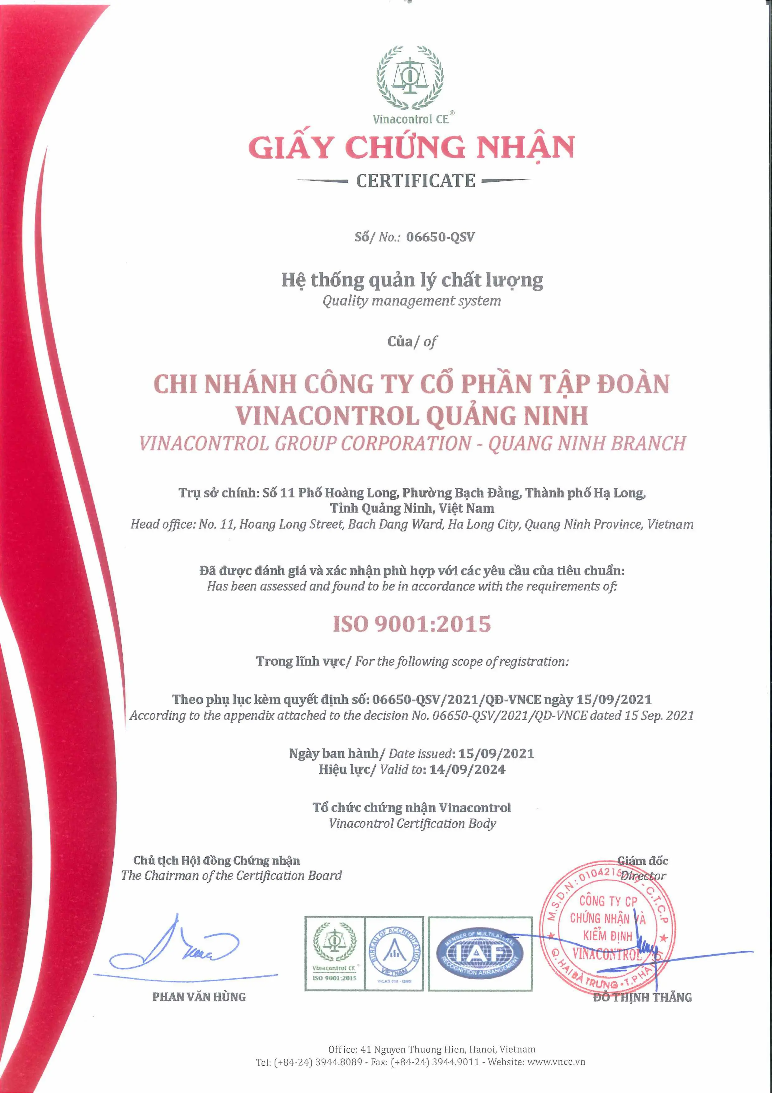 ISO 9001: 2015 - Vinacontrol Quảng Ninh