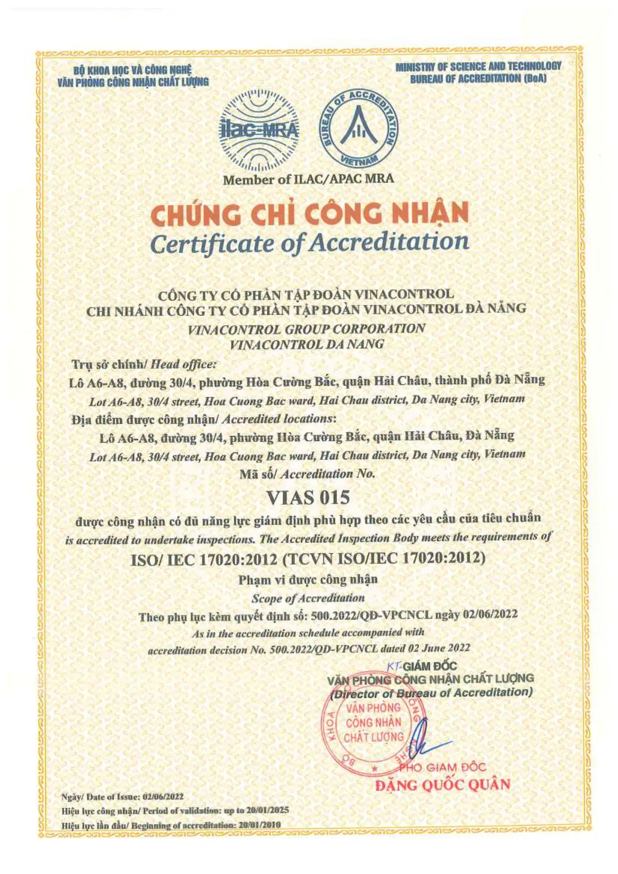 ISO/IEC 17020:2012 (VIAS 015) - Vinacontrol Đà Nẵng
