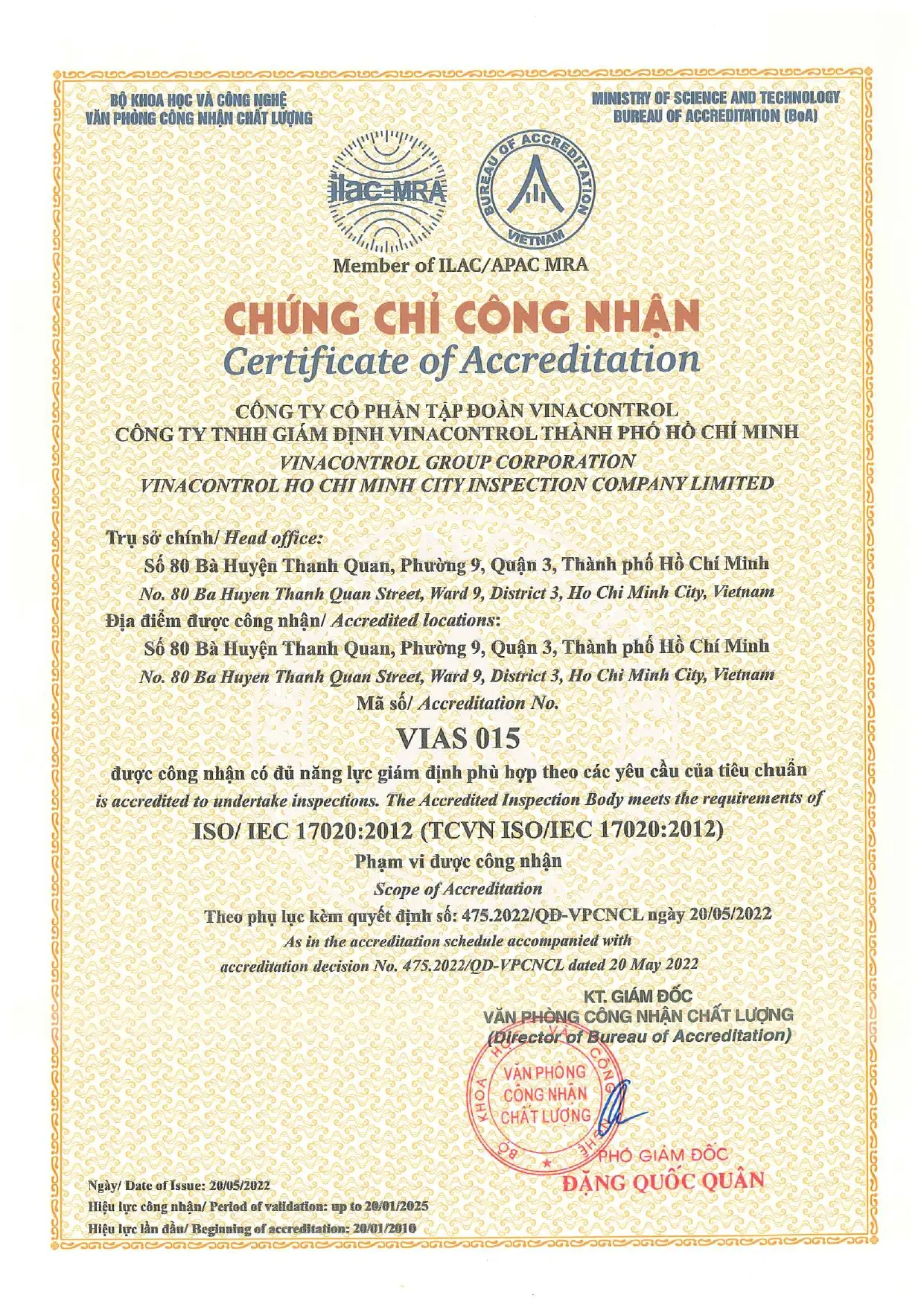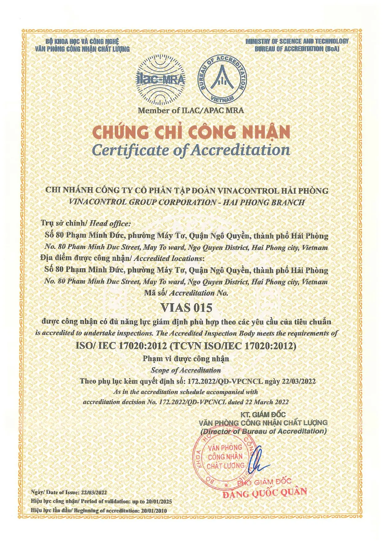 ISO/IEC 17020:2012 (VIAS 015) - Vinacontrol Hải Phòng