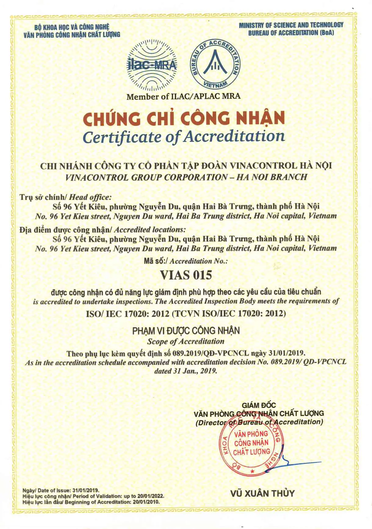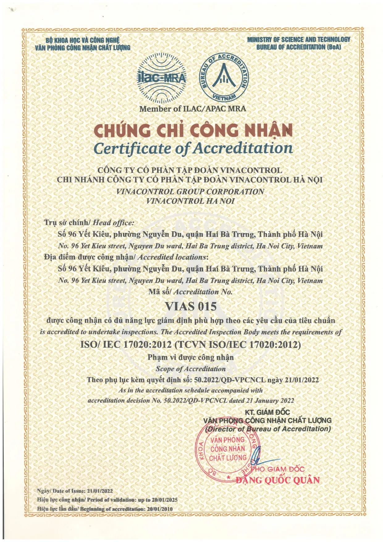 ISO/IEC 17020:2012 (VIAS 015) - Vinacontrol Hà Nội
